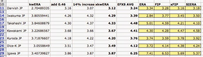 Next, I calculated Tanaka’s kwERA for his last three NPB seasons. It came out to 2.81 (24.9% K-rate and 3.3% BB-rate). Adding .46 runs to that gives an expected MLB ERA of (2.81 + 0.46) 3.27. Increasing his kwERA by 14% gives an expected MLB ERA of (2.81 * 1.14) 3.19. I then averaged these to get an expected MLB ERA of about 3.23.