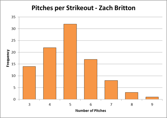 On average, it took Britton 4.96 pitches to ring the batter up. This is on the lower side of his own anecdotal description of it usually taking, “five, six, or seven (pitches).” The league-average amount of pitches it takes to record a strikeout hovers around 4.8 with a standard deviation of 0.15. Relative to his peers, Britton it appears is slightly less efficient, but not by much. A simple hypothesis test shows that, at the 0.05 significance level, he is not less efficient than other pitchers.
