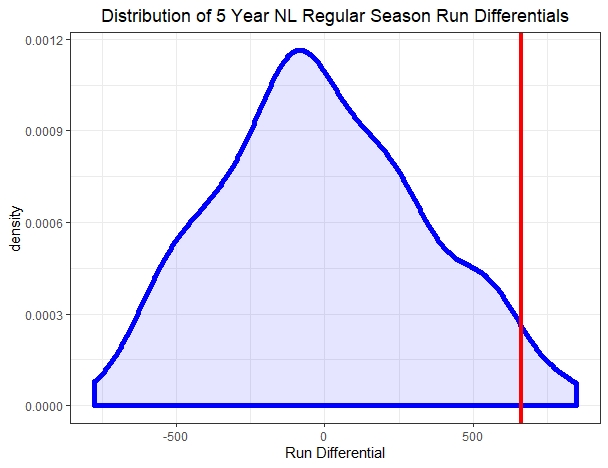 I wanted to see how this stretch of Cubs baseball compared to all other five-year stretches by every National League team from 1994 through this season (I chose 1994 because that was the start of the modern playoff structure). The following plot shows the distribution of five-year run differentials: