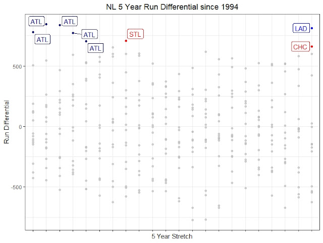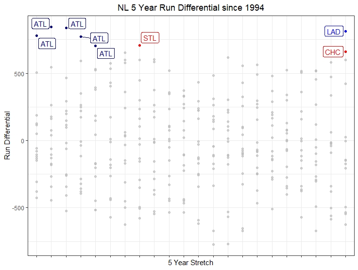 The red line represents the Cubs’ run differential from 2015 through 2019, which was 662 runs. This was one of the top figures over any five-year stretch for any National League club. The following scatter plot highlights the only clubs who outscored their opponents more than the Cubs during this most recent five-year window: