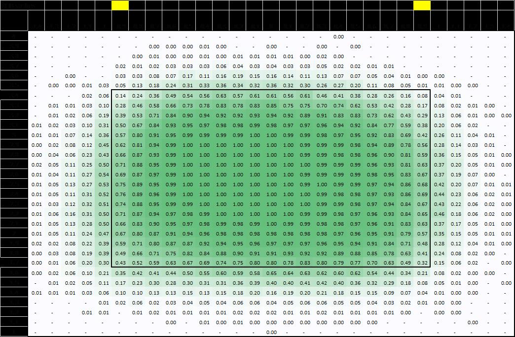 Once the strike zones were determined, I was able to go through the PITCHf/x data and tag every pitch thrown which resulted in either a ball or called strike with the associated probability of a pitch in that location being called either a ball or strike.