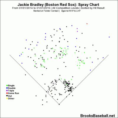 Jackie Bradley Jr. is not a terrible baseball player, and honestly he probably didn’t have a terrible 2014 season. Well at least, it wasn’t as bad as what people perceived. That, however, is due to his impeccable fielding and good baserunning. What follows will include none of that. It is rather a complete and utter breakdown of Bradley’s hitting performance, for 2014, and the trends he displayed. They, as you might have guessed, are not pretty.