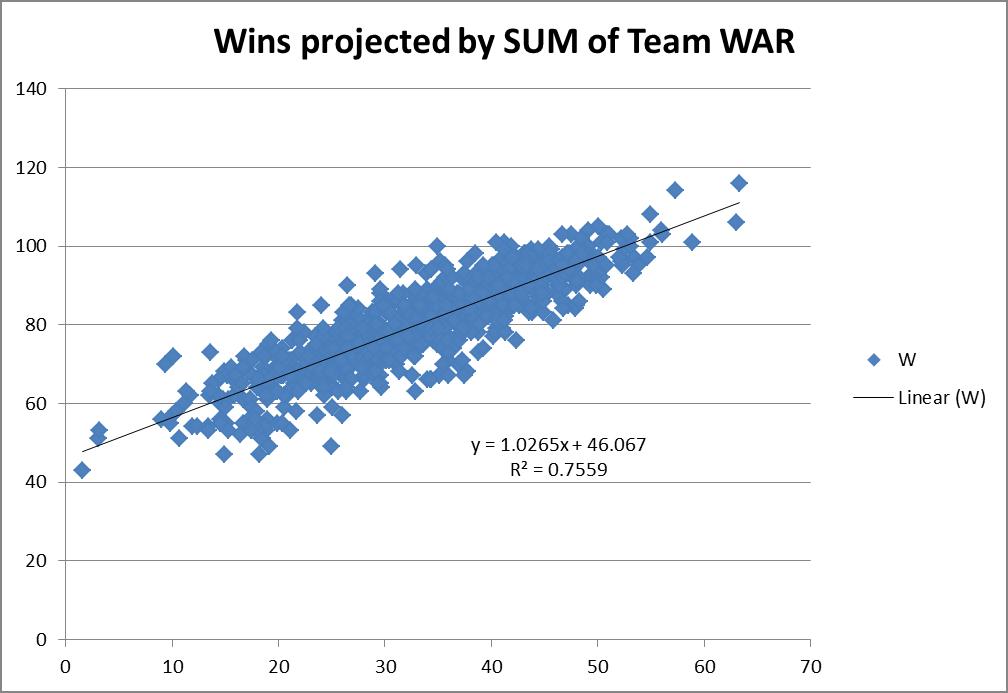 This actually projected slightly better. I do mean slightly — 0.7559 R2 versus the 0.7525 R2 when viewed as just team hitting and pitching. It also predicted basically the same replacement-level team, a 46-win one. So you could probably make the argument that it’s slightly more accurate to try to actually use the sum of the individual player WARs on the team instead of just a team calculation. But it is so close it’s probably not worth the extra effort for most exercises.